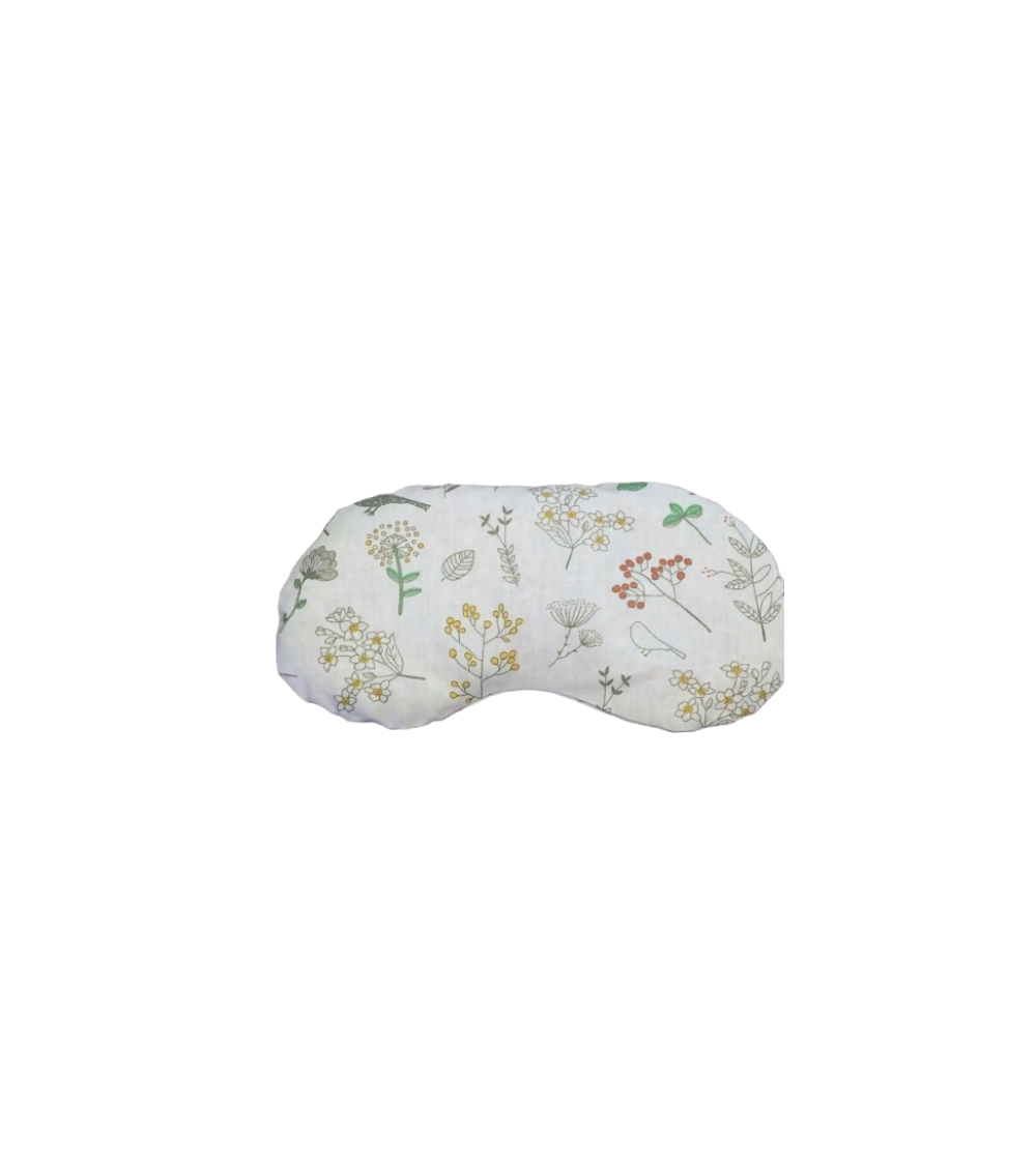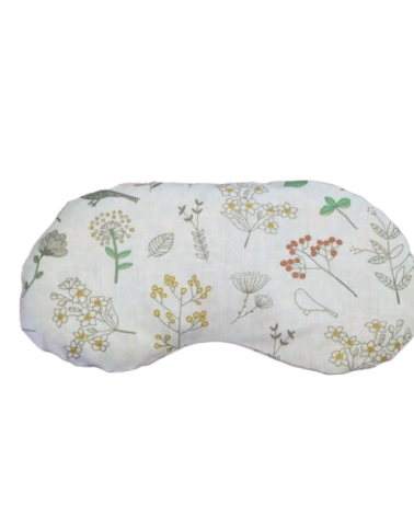 Antifaz de semillas. Confeccionado en algodón, relleno con flores de lavanda, cedrón, manzanilla y semillas de trigo. deal para relajarse y ayudar a aliviar molestias localizadas por acción de la termoterapia, dimensiones 20x10 cms y peso 240 gramos. Producto en caja.