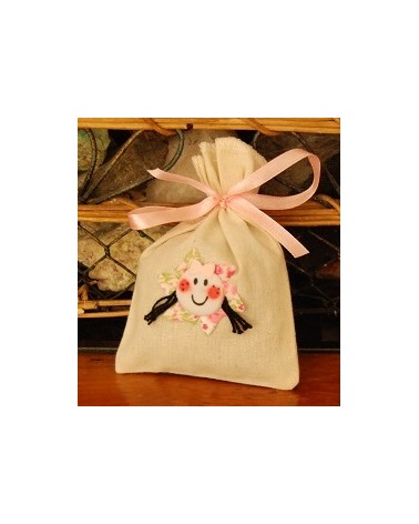 Bolsita aromática en tela algodón crea crudo de 9x13 cms. con aplicación carita, rellena con flores de lavanda natural angustifolia (17 gramos), amarrada con cinta rosada. Para cantidades sobre 12 unidades solicitar cotización a contacto@lavandas.cl.