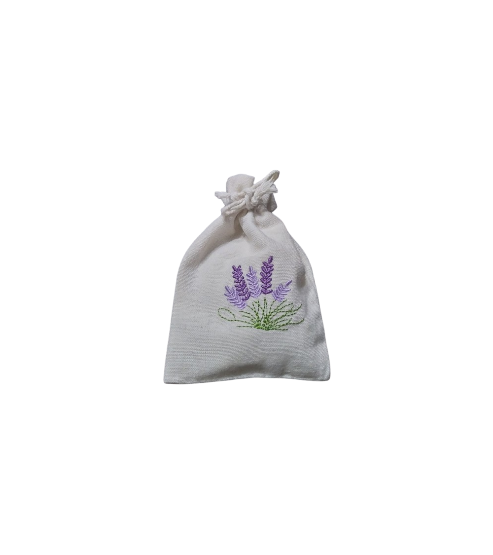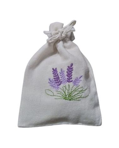 Saquito bordado de algodón, relleno con flores de lavanda. Dimensiones 10x14 cms. aprox. con 20 gramos de flores de lavanda.Para aromatizar ambientes pequeños y como antipolillas (en closet, autos, cajones, etc.). La lavanda posee además propiedades en el sistema nervioso central, siendo considerada como un relajante e inductor del sueño natural.
