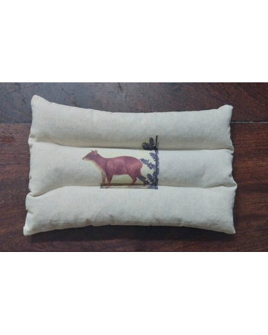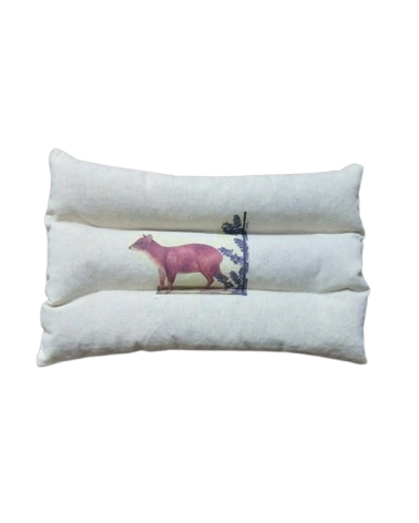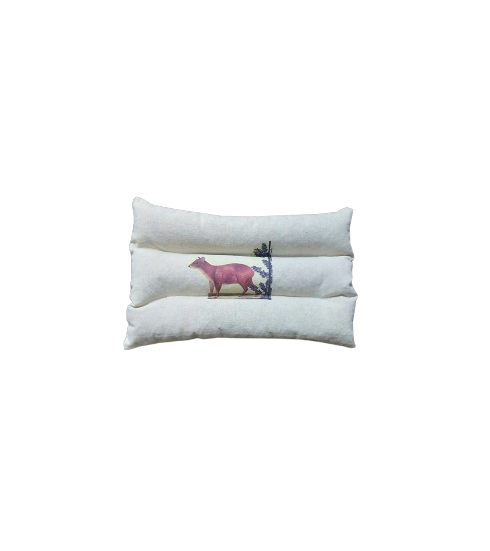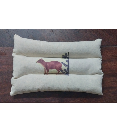 Confeccionado en tela de algodón crea cruda, diseño pudú (estampado con tintas vegetales).